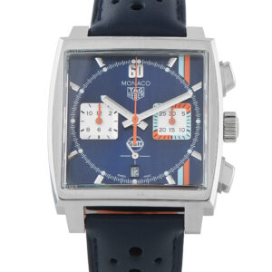 Launched in 2022 is this fantastic TAG Heuer Monaco x Gulf Special Edition watch. The ref.CBL2115-FC6494 features a 39mm angular square steel case in finely brushed and polished finishes with a domed and beveled sapphire crystal protecting the sunray brushed blue dial. On the dial are SuperLuminova-filled hands and applied indexes, a silver opaline 12-hour counter, and a 30-minute counter with the iconic colours of Gulf. On the right side of the dial are two thin light blue and orange stripes and a large 60 at 12:00 as a nod to the Porsche Gulf racing cars’ number. Discreetly positioned at 6:00 are the small seconds and the date. Powering this watch is the Heuer 02 automatic chronograph movement with 80 hours of power reserve. The watch has a 100-meter water resistance and is worn on a perforated calf skin strap in blue.