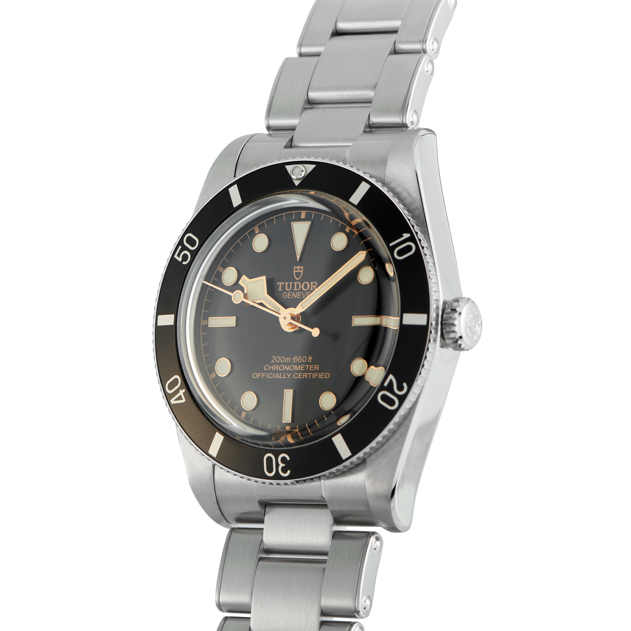 The ref. 79000n-0001 brings the Black Bay back to 37mm, echoing Tudor’s 1950s dive watch proportions. The case is stainless steel with a unidirectional bezel bearing a black aluminum insert with silver-toned markings. The dial is flat black, punctuated by applied markers filled generously with Super-LumiNova, and broad, angular Snowflake hands. The gilt accents reference early Tudor divers while keeping a modern identity. Crown guards are absent, and water resistance is rated to 200 meters. At its heart beats the in-house MT5400 caliber, COSC-certified, with 70 hours of power reserve.