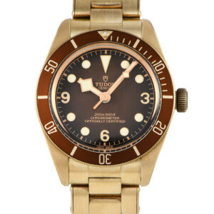 Papers, the manufacturer’s box, and an extra fabric strap accompany this pre-owned Tudor Black Bay Fifty-Eight Bronze Boutique Edition Men’s Watch 79012M.