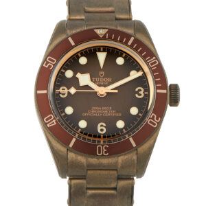 A living timepiece, this Tudor Black Bay Fifty-Eight Bronze ref. 79012M is uniquely defined by its rich, natural patina that it has acquired from its previous adventures. Its 39mm case and bracelet were made from satin-brushed bronze. The rich brown dial is paired with luminescent snowflake hands and hour markers, ensuring clarity at all times. The unidirectional rotating bezel also has a matching brown-bronze anodized aluminum insert with a 60-minute graduation. Powering the watch is the in-house Manufacture Caliber MT5400, a COSC-certified automatic movement wtih a power reserve of approximately 70 hours.