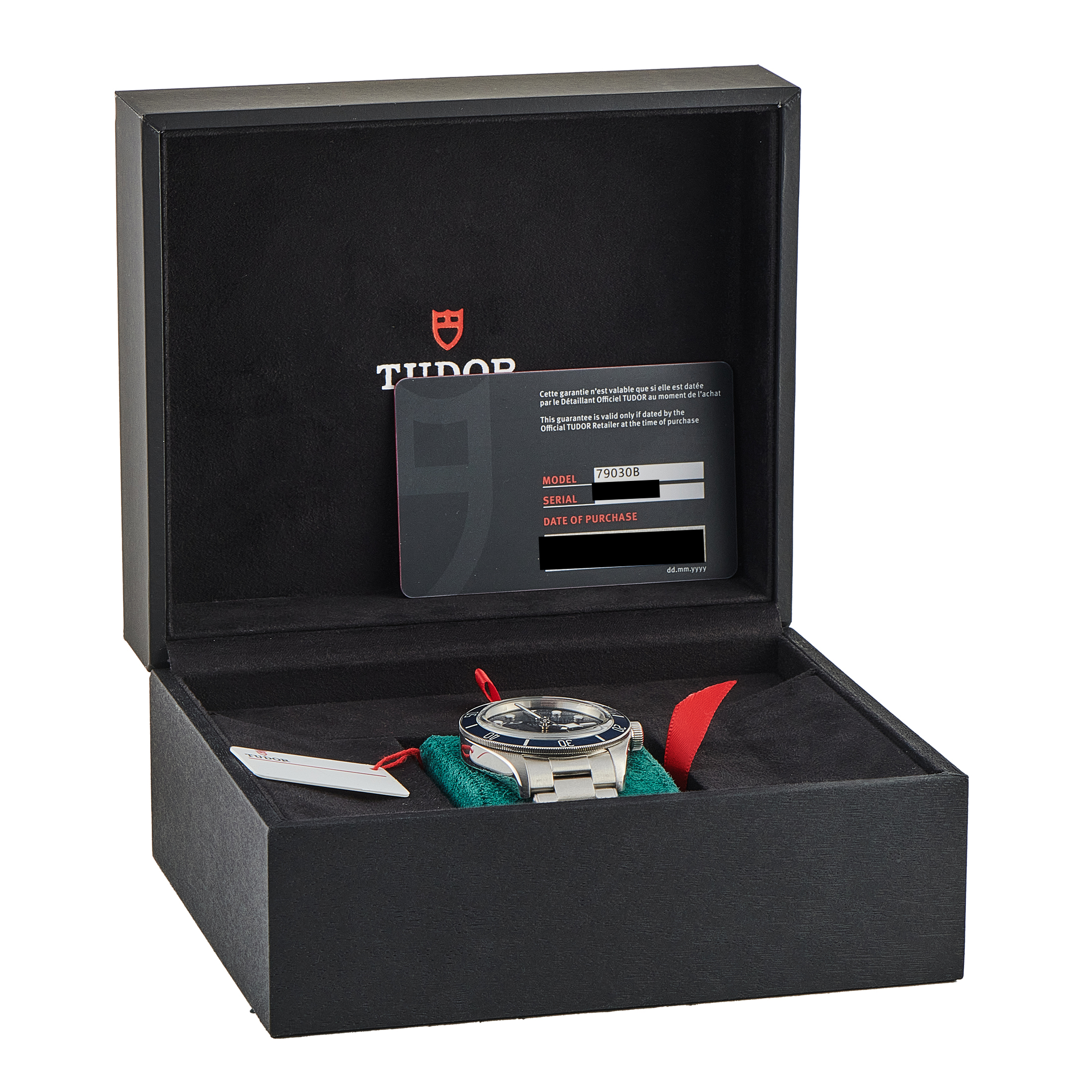 Papers and the manufacturer’s box accompany this pre-owned Tudor Black Bay 58 Steel Watch 79030B.