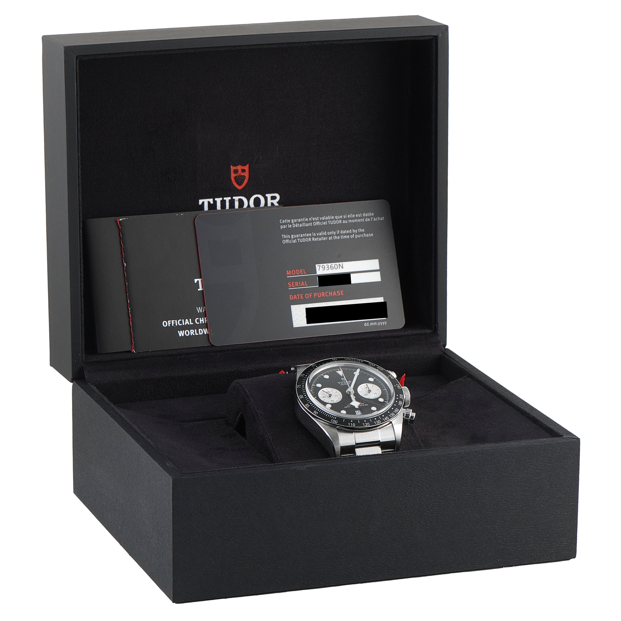 This pre-owned Tudor Black Bay Reverse Panda Chronograph Steel Watch 79360N is accompanied by papers and the manufacturer’s box.