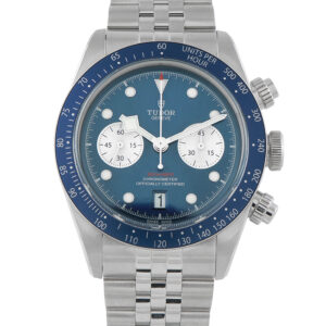 A standout Black Bay Chronograph known for its “Tudor Blue” sunray-brushed dial and matching blue anodized aluminum bezel. Its steel case carries a purposeful weight, balanced by a five-link steel bracelet. An ultra-domed sapphire crystal protects the dial that features silver-colored subdials and the signature Snowflake hands. Housed within the 41mm case is the high-performance MT5813 caliber, offering chronometer-grade precision and a weekend-proof power reserve of approximately 70 hours.