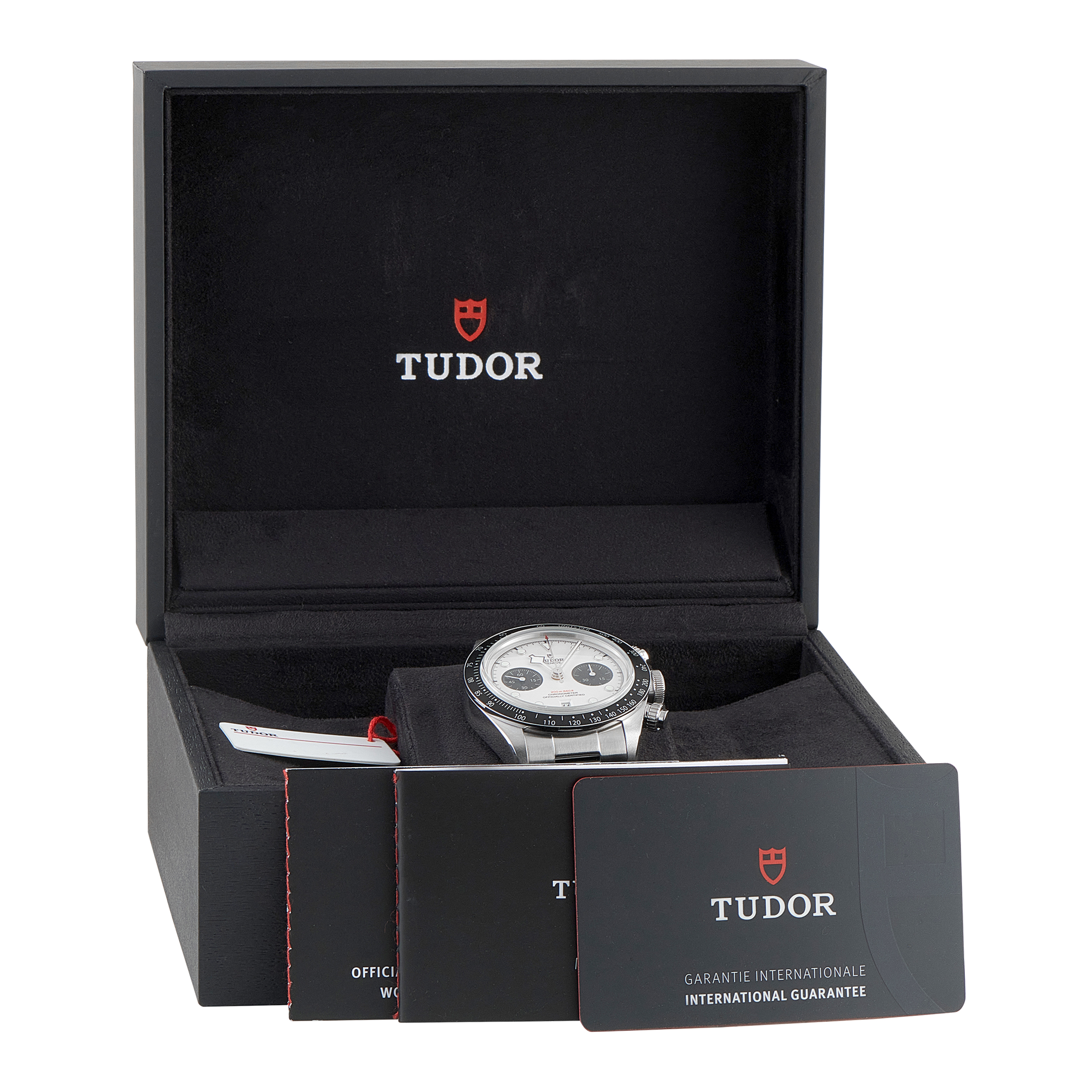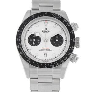 Papers and the manufacturer’s box accompany this pre-owned Tudor Black Bay Chrono Panda Steel Watch 79360N.