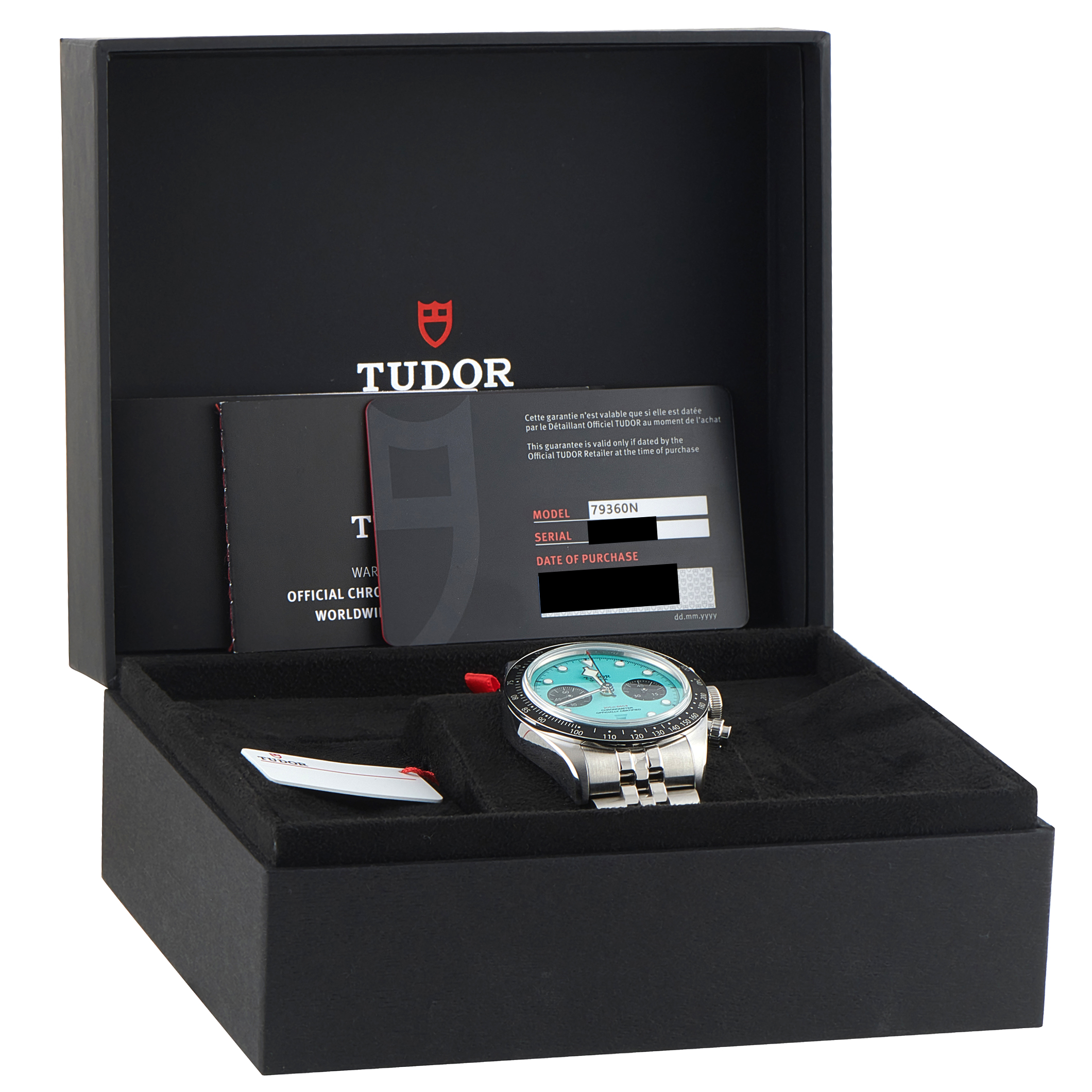Papers and the manufacturer’s box accompany this pre-owned Tudor Black Bay Turquoise Dial Steel Watch 79360N.