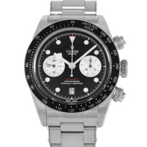 This watch pairs a 41mm Stainless Steel case with a Stainless Steel bracelet. It also includes a Stainless Steel bezel with an inlaid black aluminum ring featuring tachymeter markings. On the black dial, you’ll find luminous silver toned hands, luminous index markers, contrasting chronograph subdials, and a date dial located at the 6-o-clock position. It’s powered by a Tudor calibre MT5813 automatic movement with a power reserve of approximately 70 hours. This impressive diving watch is also water resistant up to 200 meters.