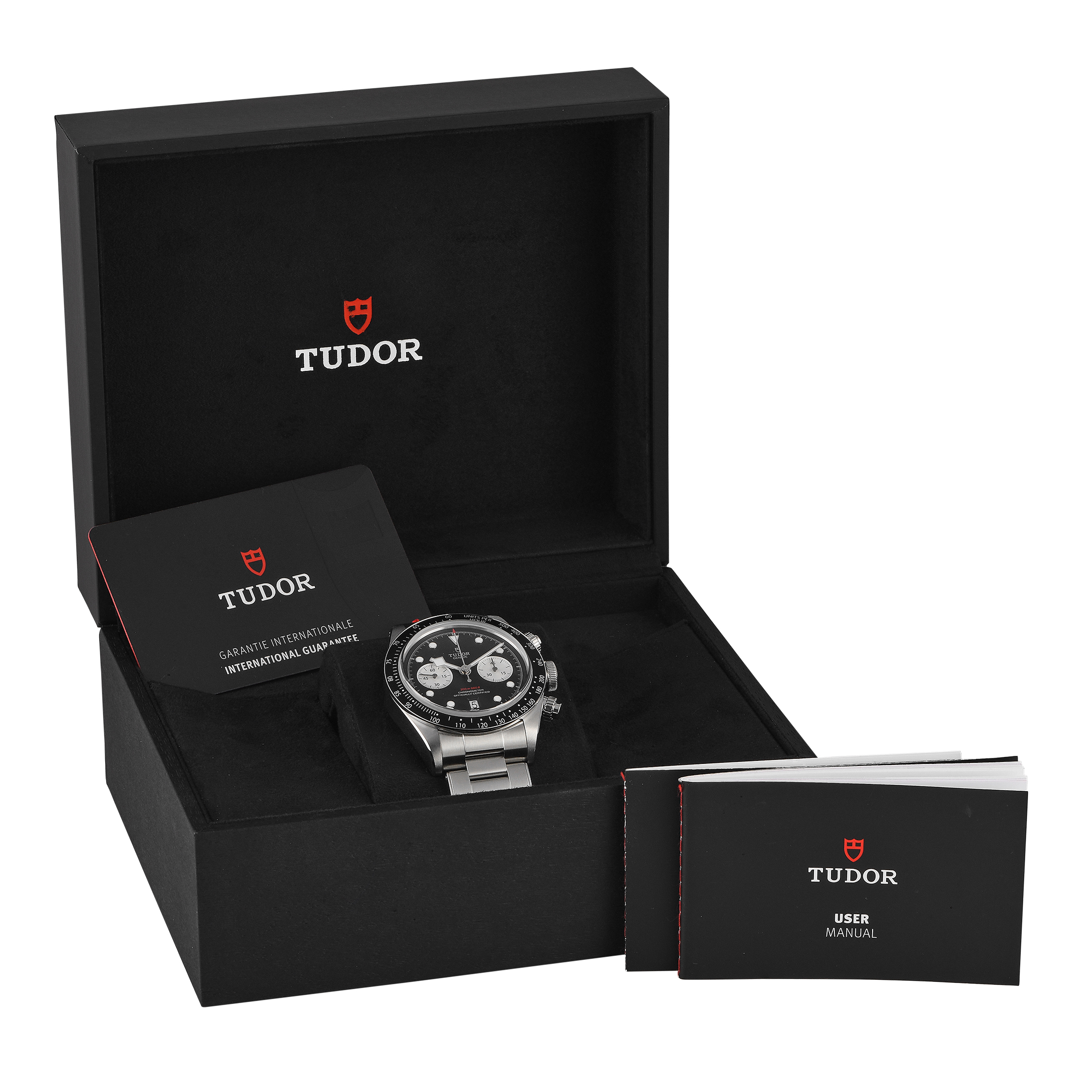 This unworn Tudor Black Bay Chrono Watch 79360N comes with papers and the manufacturer’s box.