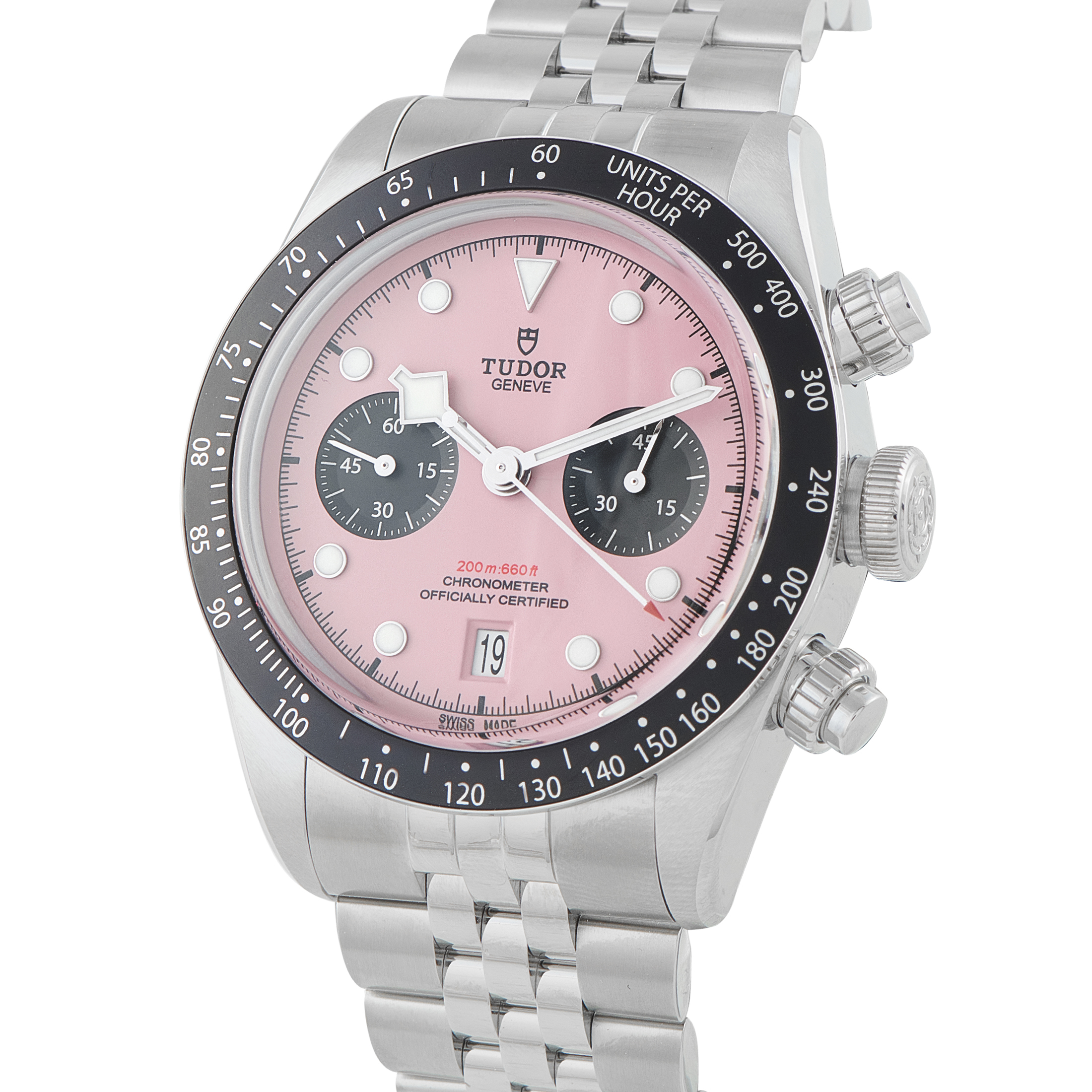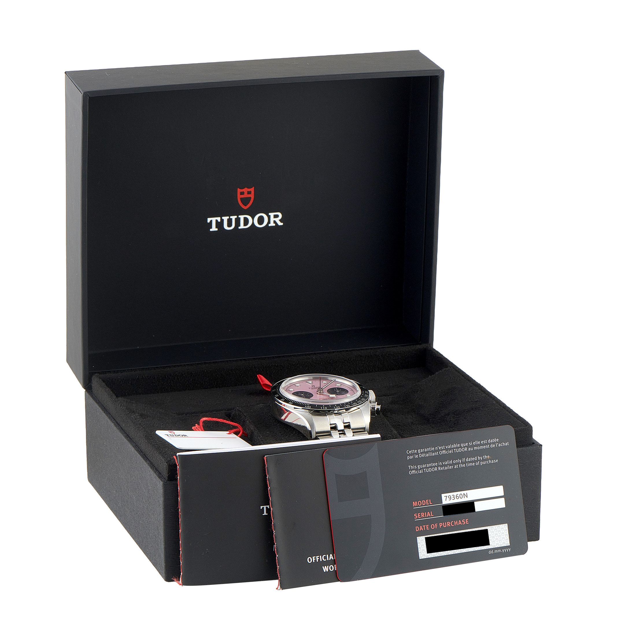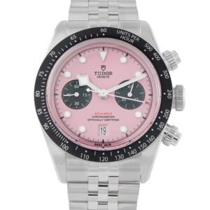 This unworn Tudor Black Bay Chronograph Pink Dial Watch 79360N-0019 is accompanied by papers and the manufacturer’s box.