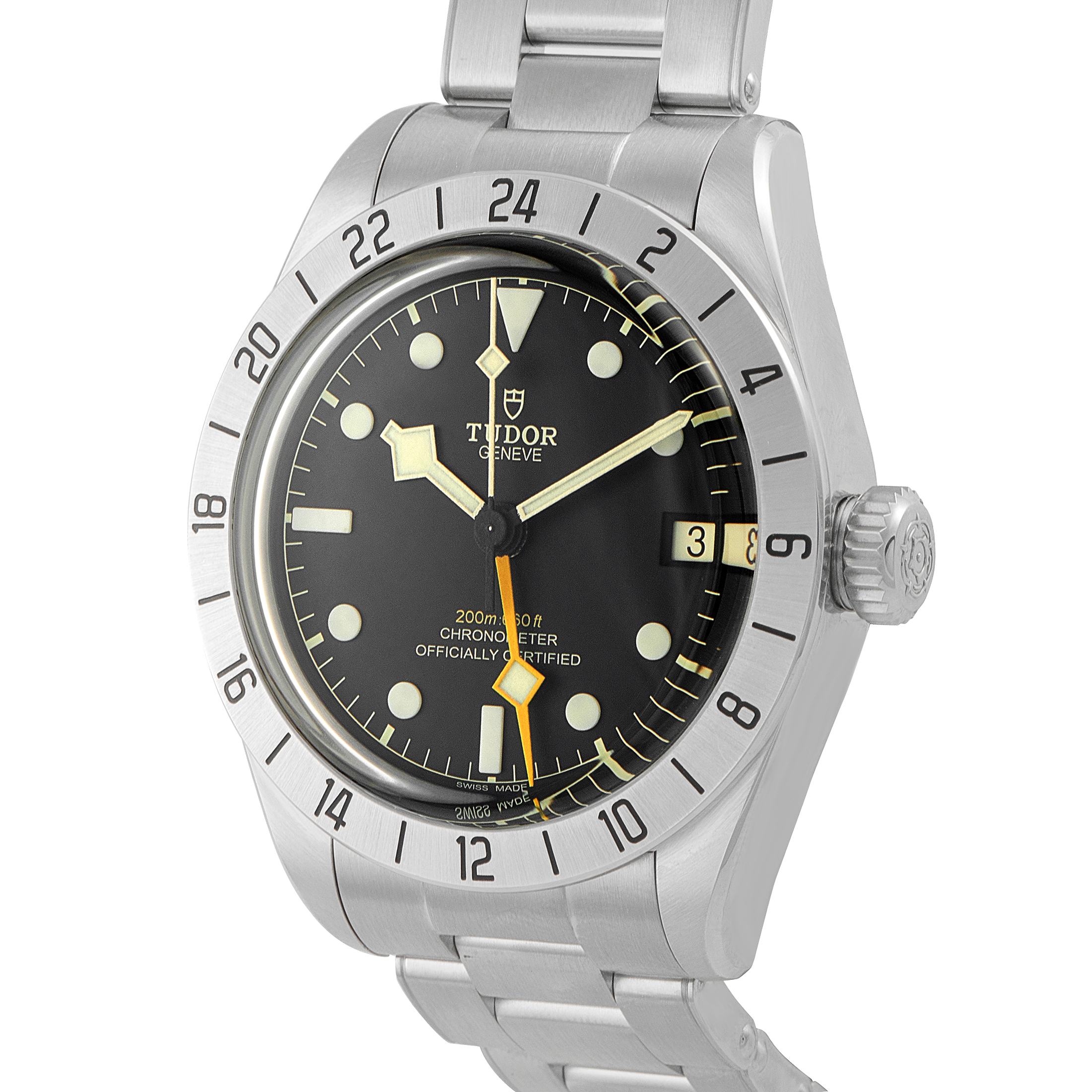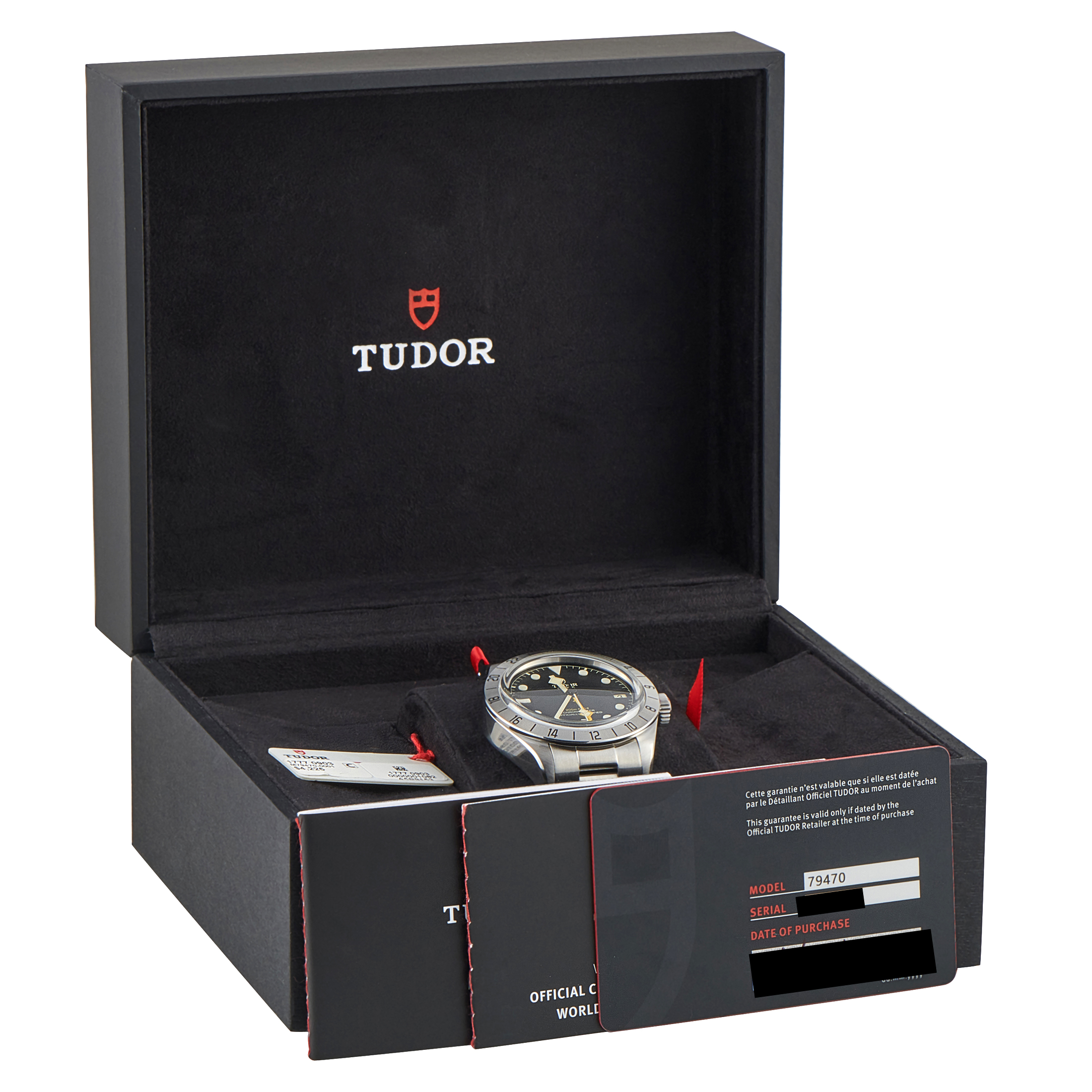 Papers and the manufacturer’s box accompany this Tudor Black Bay Pro Steel Watch 79470.