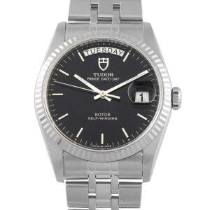 Neither purely formal nor strictly utilitarian, this Tudor Prince ref. 76214 occupies a flexible middle ground. Its solid steel body and fluted white gold bezel create visual interest, offering enough character for long-term ownership. A black dial provides a neutral base for slim hour markers and hands, and the day and date apertures. Housed within the 36mm case is the reliable and easy-to-service automatic caliber ETA 2834-2, reinforcing the watch’s role as a no-fuss timepiece.