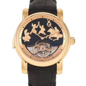 The Ulysse Nardin Westminster Jaquemarts Genghis Khan Tourbillon Minute Repeater (Ref: 786-88) blends classic artistry with modern haute horology. Its Westminster minute repeater chimes the time using four gongs, mimicking the melody of London’s Big Ben. The visible one-minute tourbillon enhances timekeeping precision, while the jaquemarts—animated figures depicting Genghis Khan and his warriors—move in harmony with the chimes. Two “fight” with their curved swords, another attempts to catch a small ring with a spear while riding an impressively crafted horse, and the last figure plays a musical instrument.
