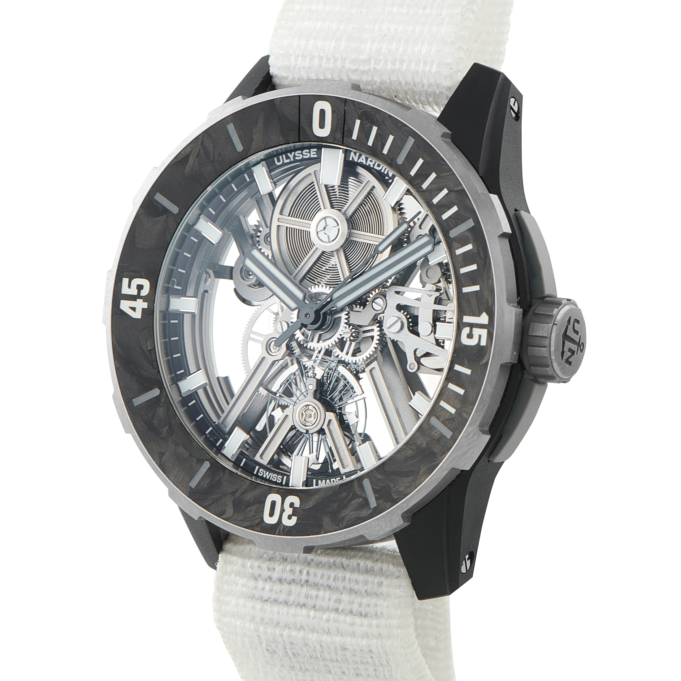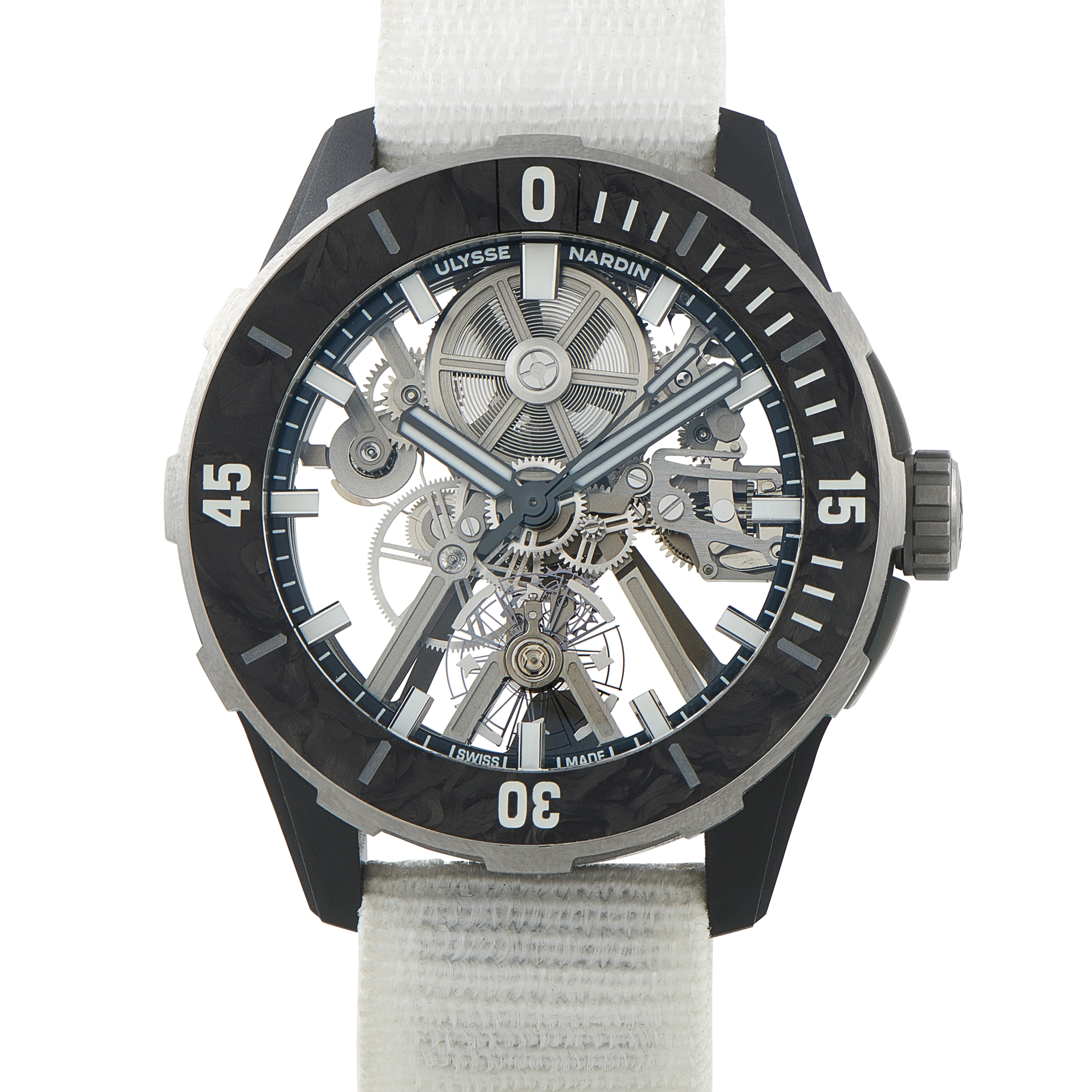 At just 52 grams including the strap, the Ulysse Nardin Diver AIR ref. 3743-170-2A is built around one goal, and it’s to reduce weight as far as possible. Extensive skeletonization removes material from both the case and movement, resulting in one of the lightest dive watches produced. Titanium construction, paired with Nylo-Foil carbon fiber, keeps the structure strong while limiting mass. Large hands and markers preserve legibility on the openworked dial. Dependability is supported by the UN-374 automatic caliber, which uses a silicon escapement wheel, anchor, and balance spring for stable timekeeping and increased resistance to magnetism and shock.