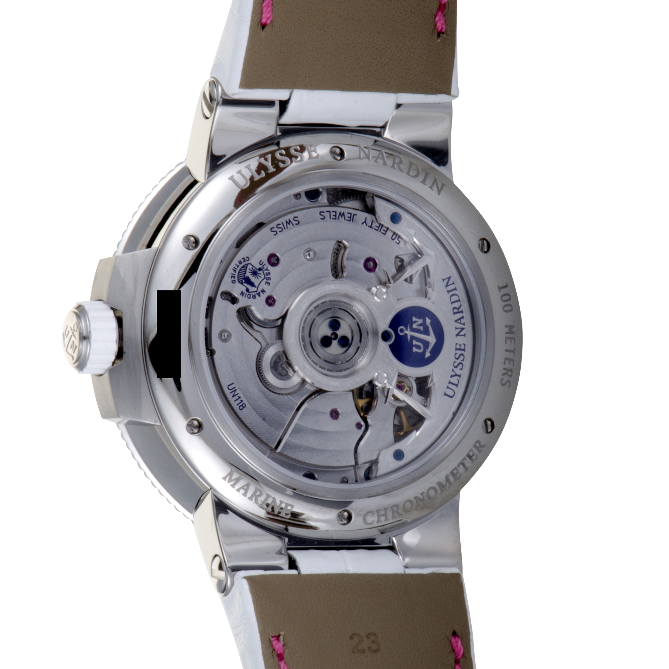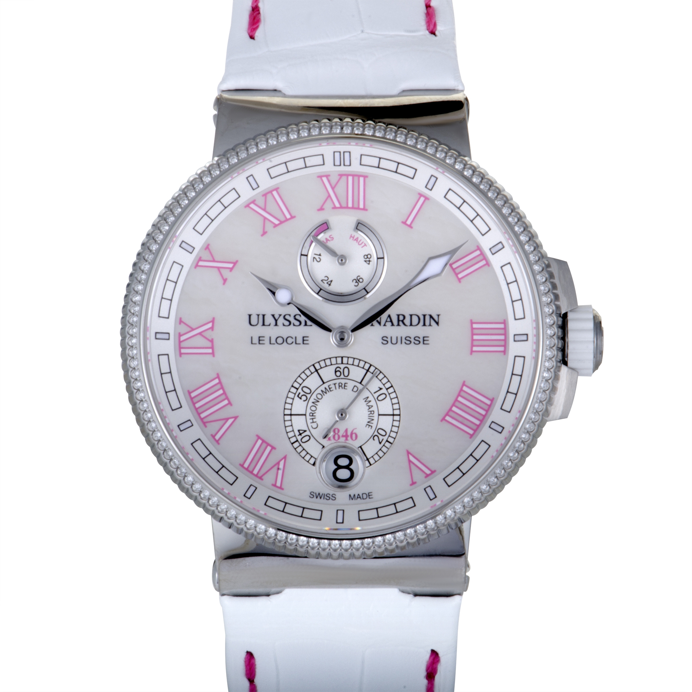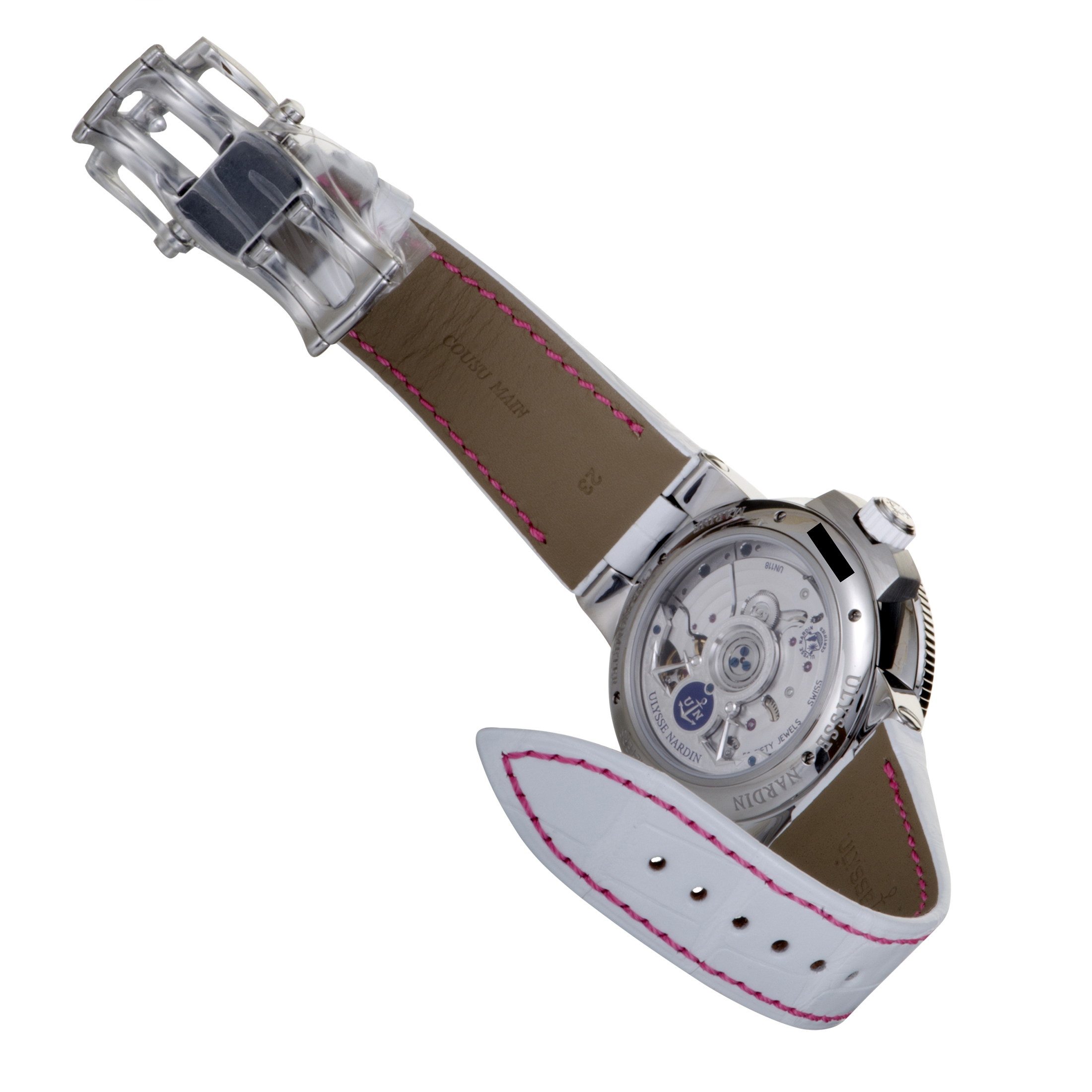 A lovely ladies timepiece from Ulysse Nardin, featuring round-shaped 43mm case made of titanium and stainless steel with transparent sapphire crystal case-back, combined with bezel set with 120 diamond-stones. The dial boasts a charming combination of white mother-of-pearl shade with pink-colored Roman figures, and features centered hours and minutes, small seconds and date window at six o’clock and power reserve indicator positioned at 12 o’clock. The tasteful dial is wonderfully combined with white alligator leather strap, with pink stitches matching the shade of the hour numerals on the dial. This timepiece is powered by automatic UN-118 movement with 60-hour power reserve, and it’s water resistant to 100 meters. Edition is limited to 150 pieces.