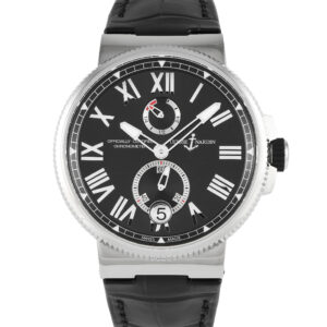 An interesting timepiece with a strong wrist presence. The Ulysse Nardin Marine Chronometer ref.1183-122/42 is designed with a 43mm steel case, a scratch-resistant sapphire crystal, a coin-edged fixed bezel, and a rubber-coated crown. It also has a flat black dial with superb detailing. You’ll find an inner bezel flange with luminous hour markers and a printed minute track, applied steel Roman numeral hour markers, large steel hands with luminous tips, a silver-rimmed small seconds sub-dial and a date window at 6, and a power reserve indicator at 12. Inside the watch beats Caliber UN-118 automatic movement with 50 jewels and a power reserve of approximately 60 hours.