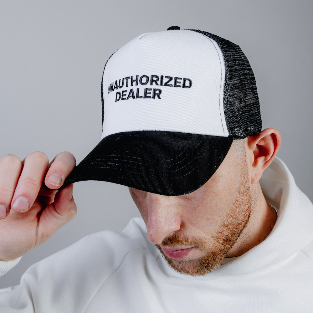 The Limited Release GREY MARKET Unauthorized Dealer® White / Black Trucker Hat features a 6-panel design providing a structured feel while also representing the Grey Market culture with an UNAUTHORIZED DEALER® embroidery on the front, an embroidered GREY MARKET logo on the right, and a Luxury Bazaar logo on the back.