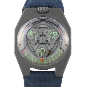 In 2022, the UR-100V made its debut, fitted with a new caliber that allowed for a redesign of the carousel for easier reading of the time. Urwerk produced several variants of the UR-100V watch including this limited edition UR-100V P.02 Limited Edition for Collective watch, released in 2021.