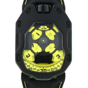 Offered pre-owned, this Urwerk UR-105TA Turbine Automatic Black Lemon Limited Edition Watch UR-105TA comes with papers, extra strap, and the manufacturer’s box.