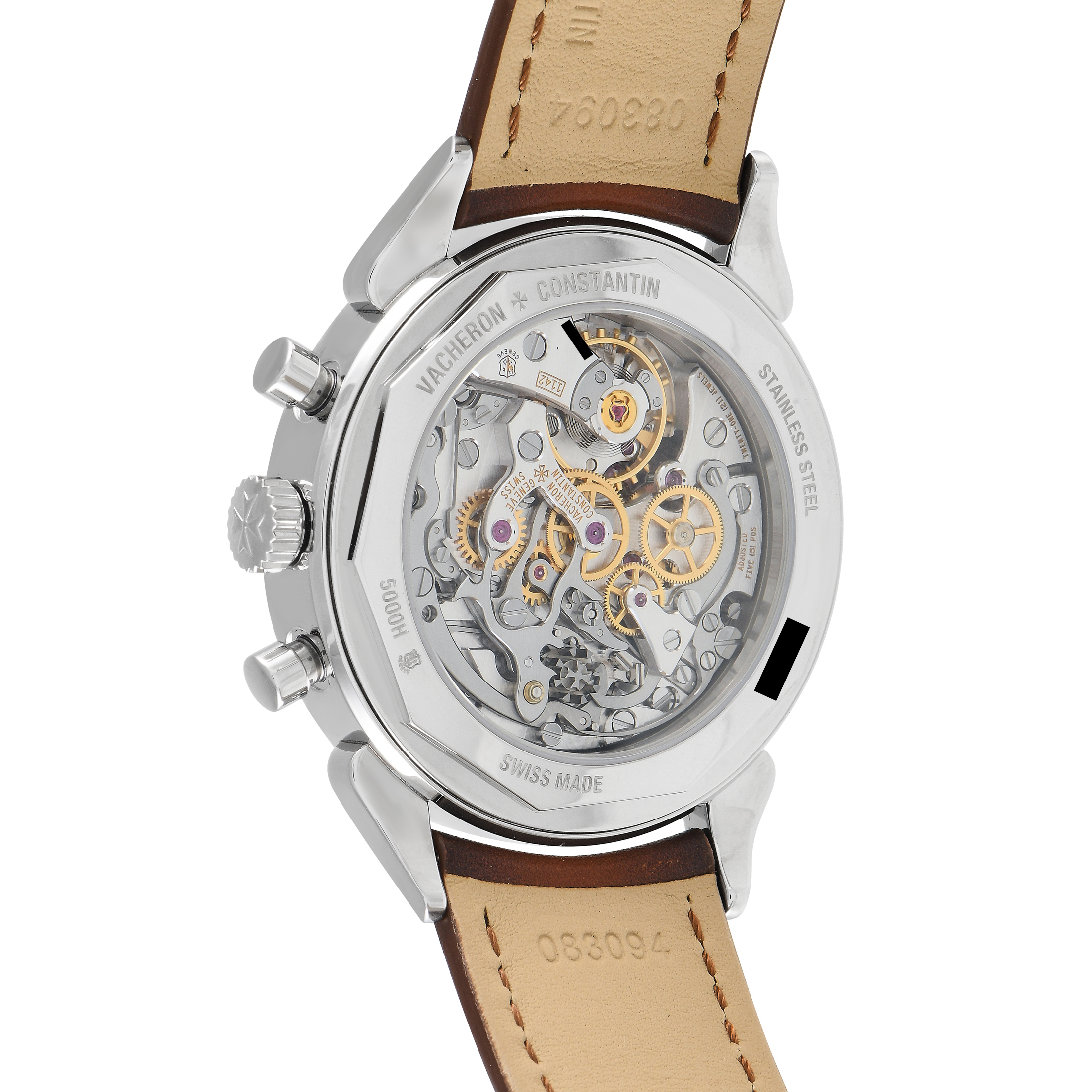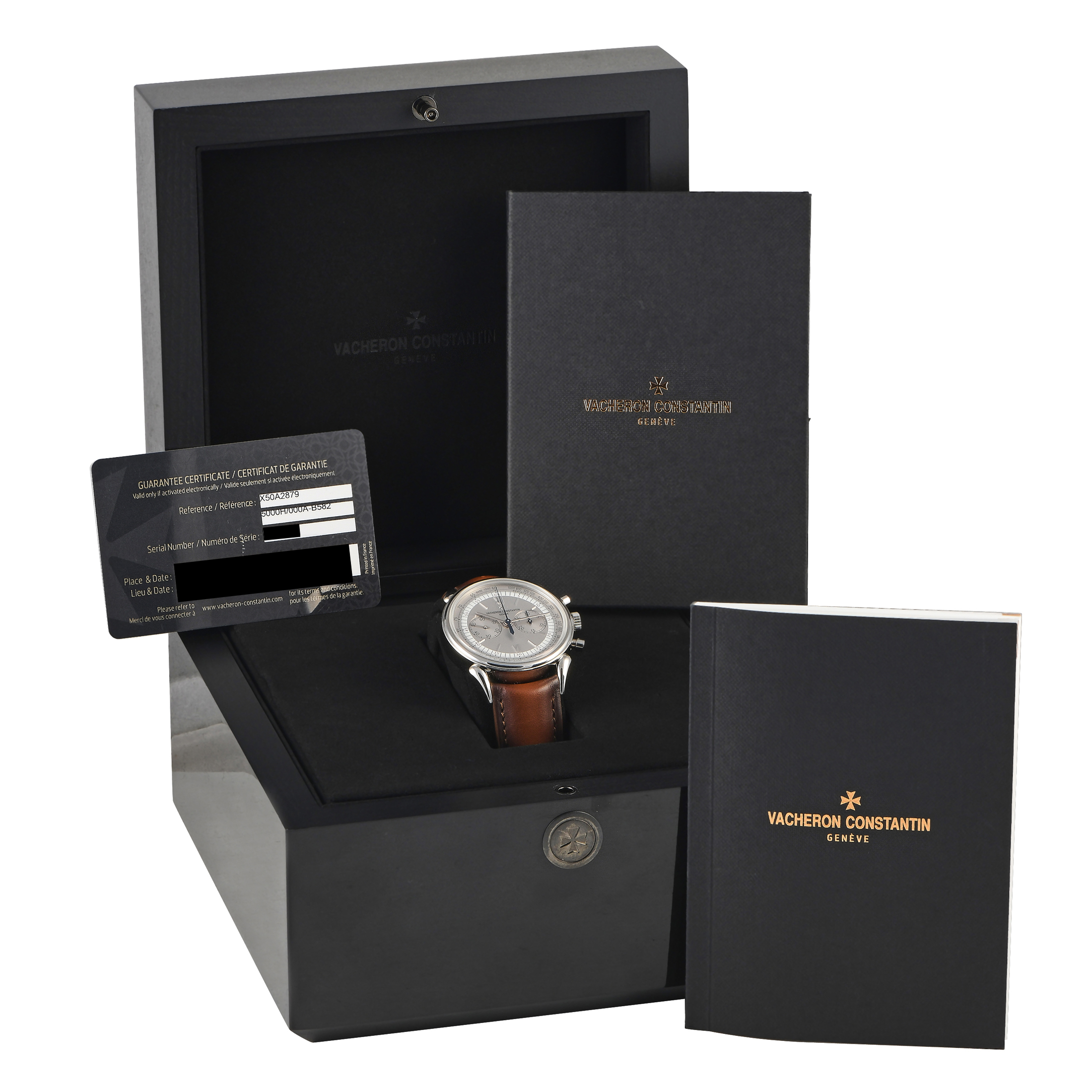 Papers and the manufacturer’s box accompany this pre-owned Vacheron Constantin Historiques Cornes de Vache 1955 Steel Men’s Watch 5000H/000A-B582.