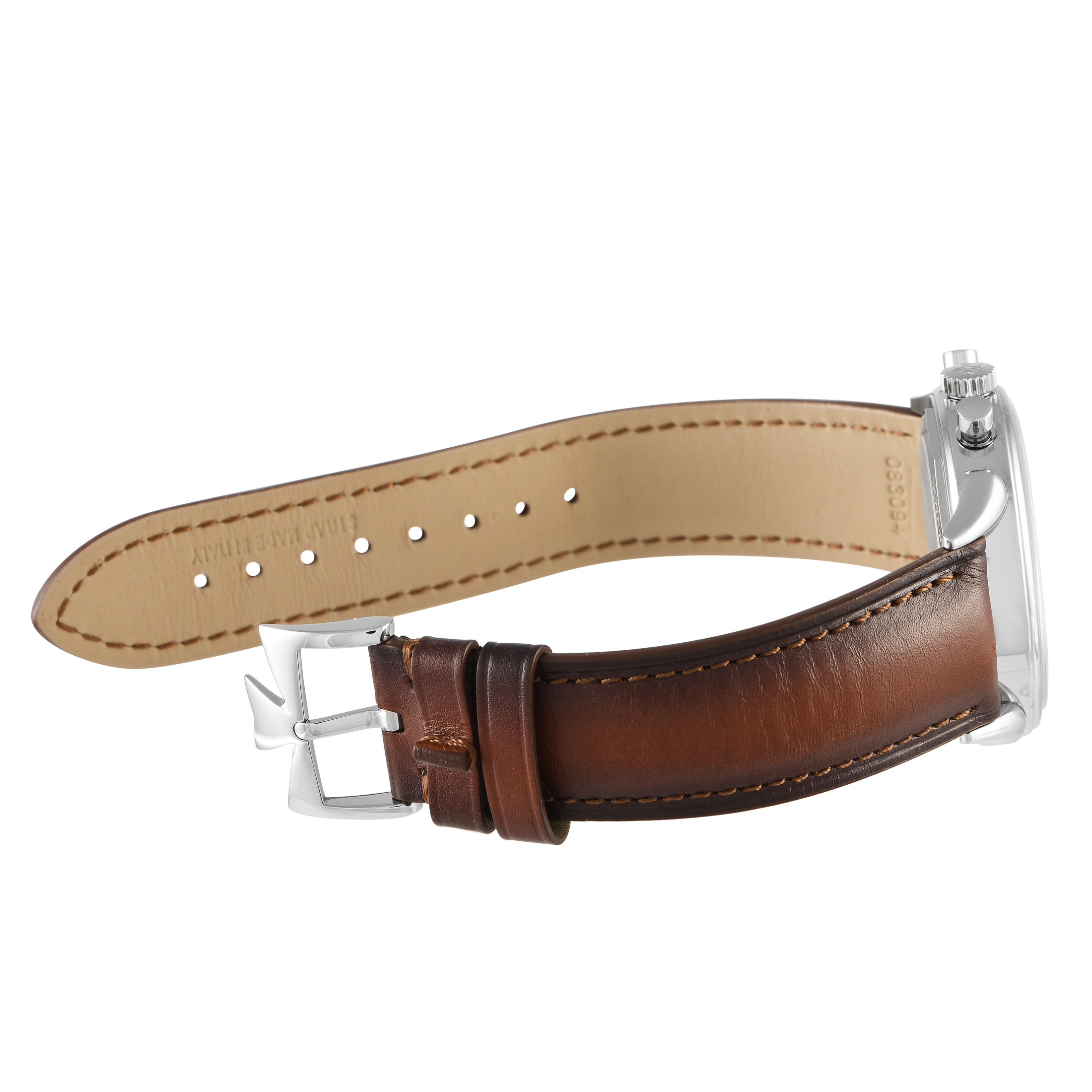 The perfect piece for days that call for a delicate dress watch. The Vacheron Constantin Historiques Cornes de Vache 1955 has a natural elegance that’s hard to resist. It features a 38.5mm stainless steel case worn on a calf leather strap with a charming brown patina. The grey opaline dial with bi-compax layout features baton hands, applied gold indexes, blued steel central seconds and chronograph hands, a white minute track, and a tachymeter scale. Seen from the sapphire caseback is caliber 1142 manual-winding movement with 164 parts, 21 jewels, and 48 hours of power reserve.