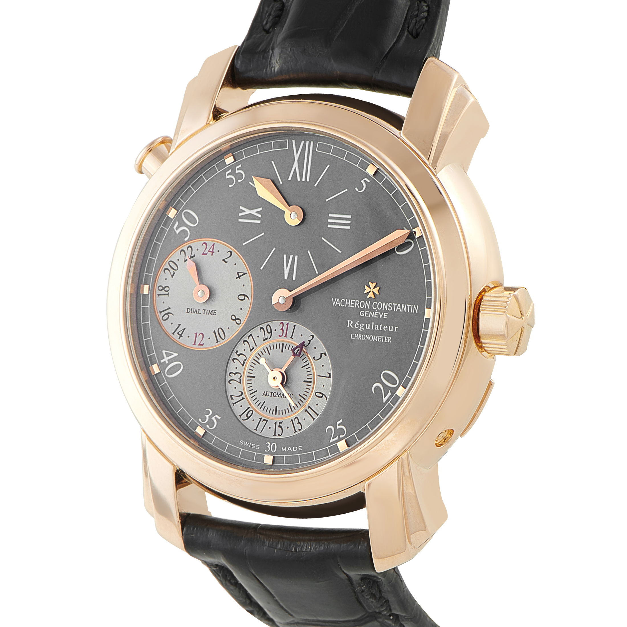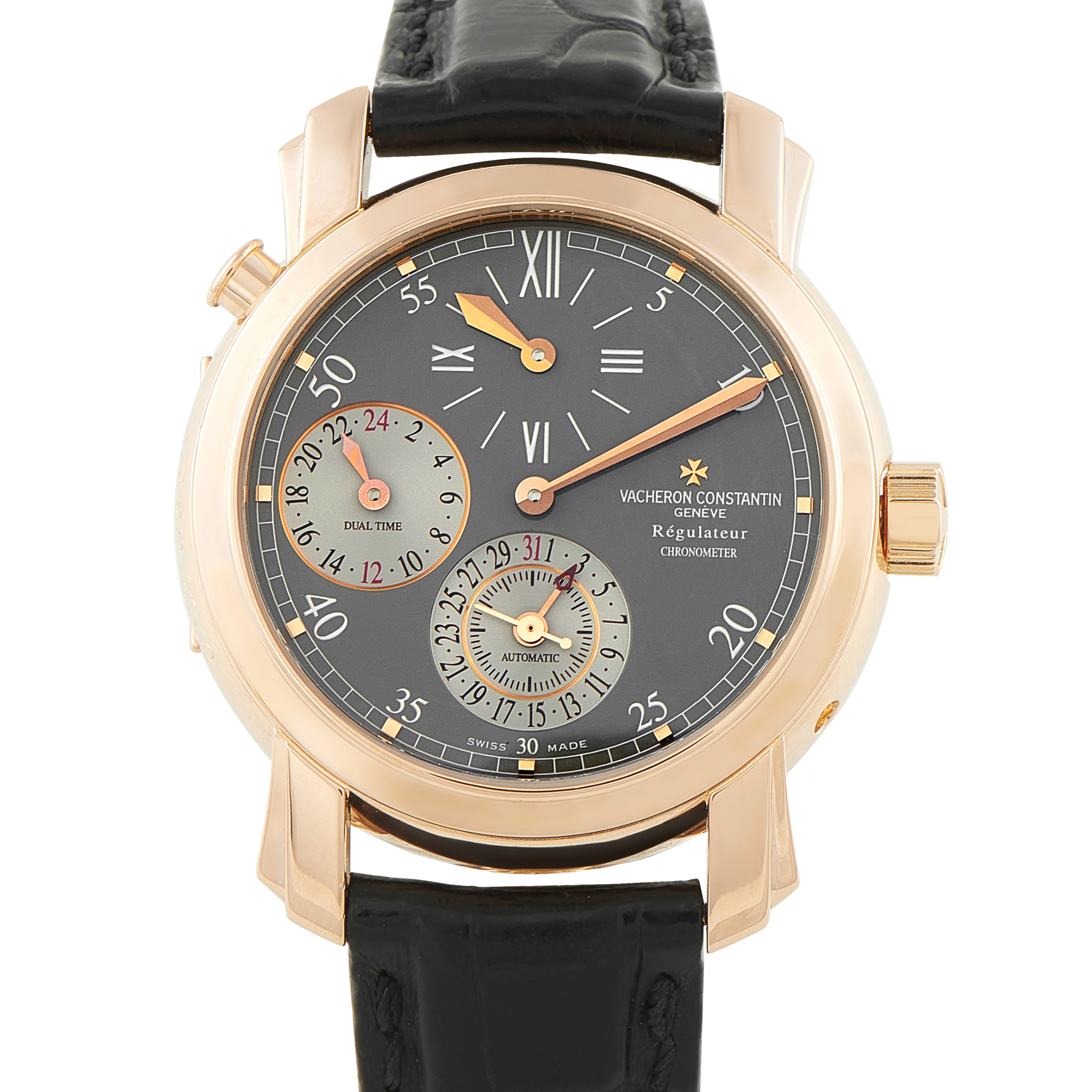Offered pre-owned, this Vacheron Constantin Malte Dual Time Regulator 18K Rose Gold Watch 42005/000R-9034 comes with the manufacturer’s box.
