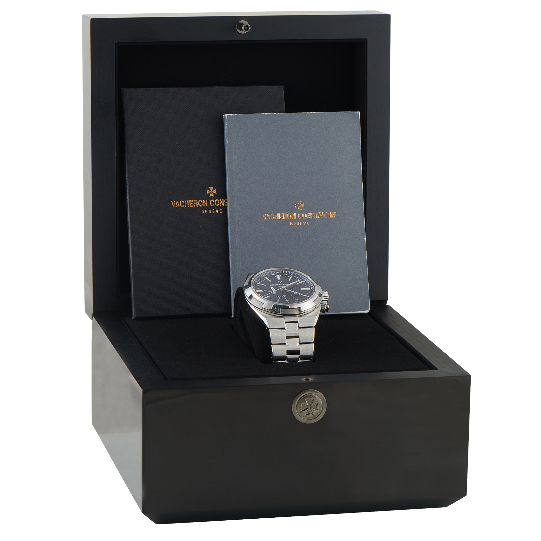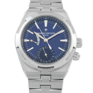 Papers, extra straps, and the manufacturer’s box accompany this pre-owned Vacheron Constantin Overseas Dual Time Steel Watch 7900V/110A-B334.