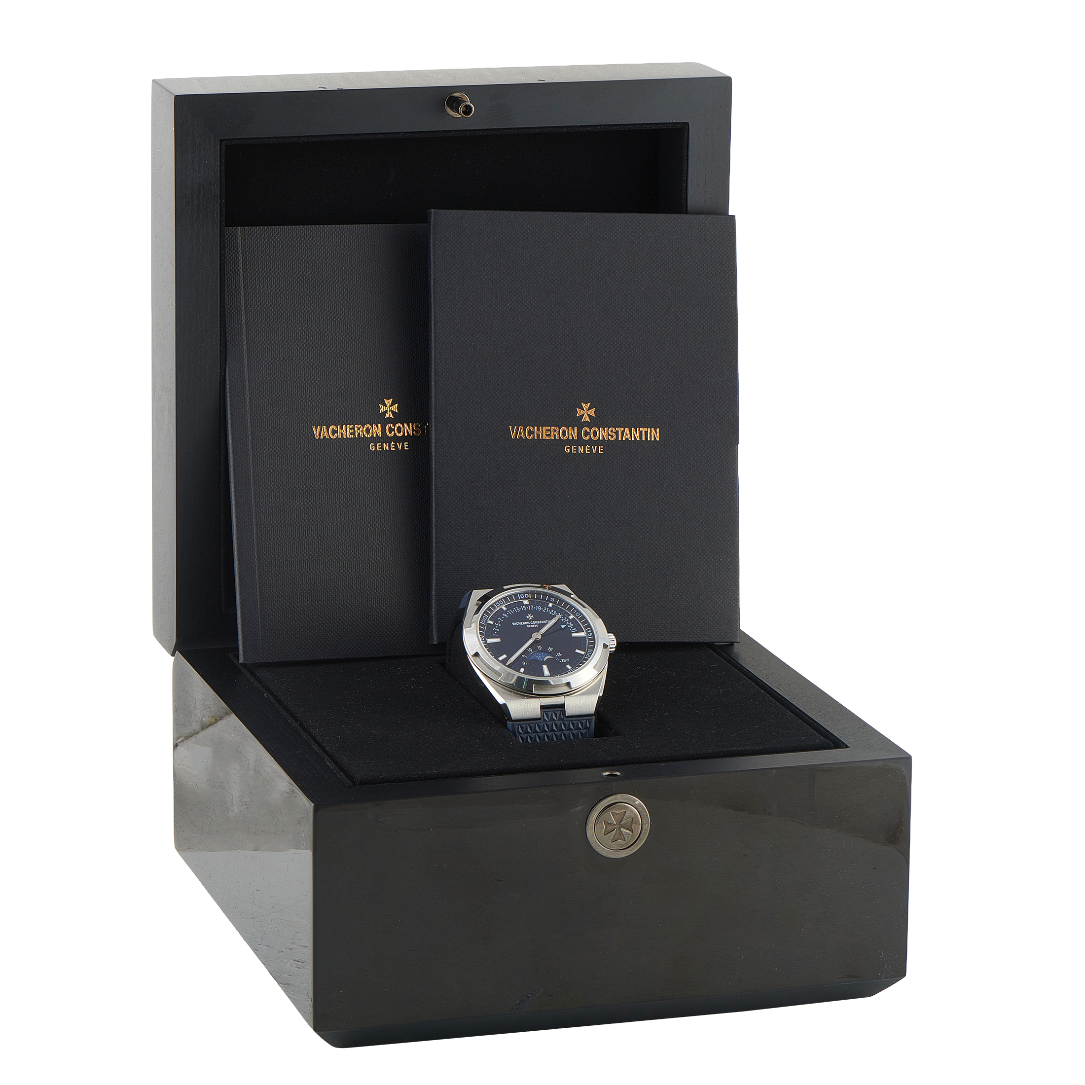 This is a pre-owned Vacheron Constantin Overseas Moon Phase Retrograde Date Steel Watch 4000V/210A-B911. It is accompanied by official documentation and the manufacturer’s box.