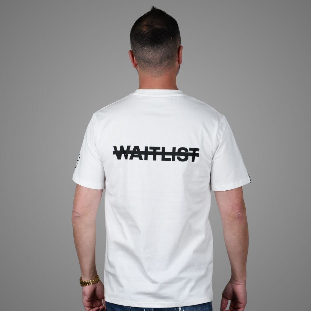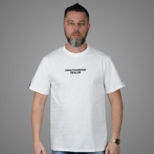 The white Unauthorized Dealer® crewneck T-shirt features an UNAUTHORIZED DEALER® rubberized graphic on the front, a rubberized LB icon on the left sleeve cuff, a GREY MARKET tag on the right sleeve cuff, and a rubberized WAITLIST graphic on the back.