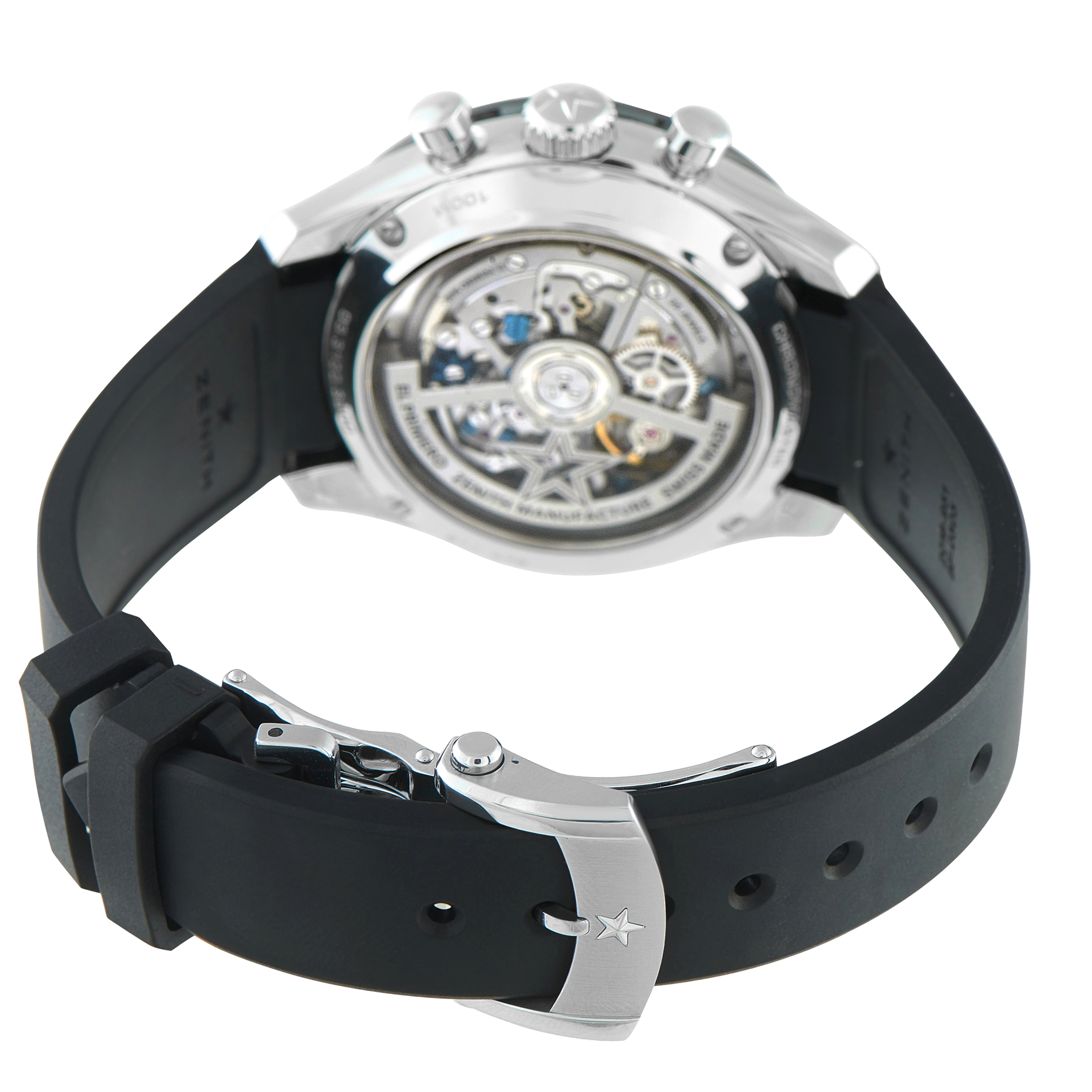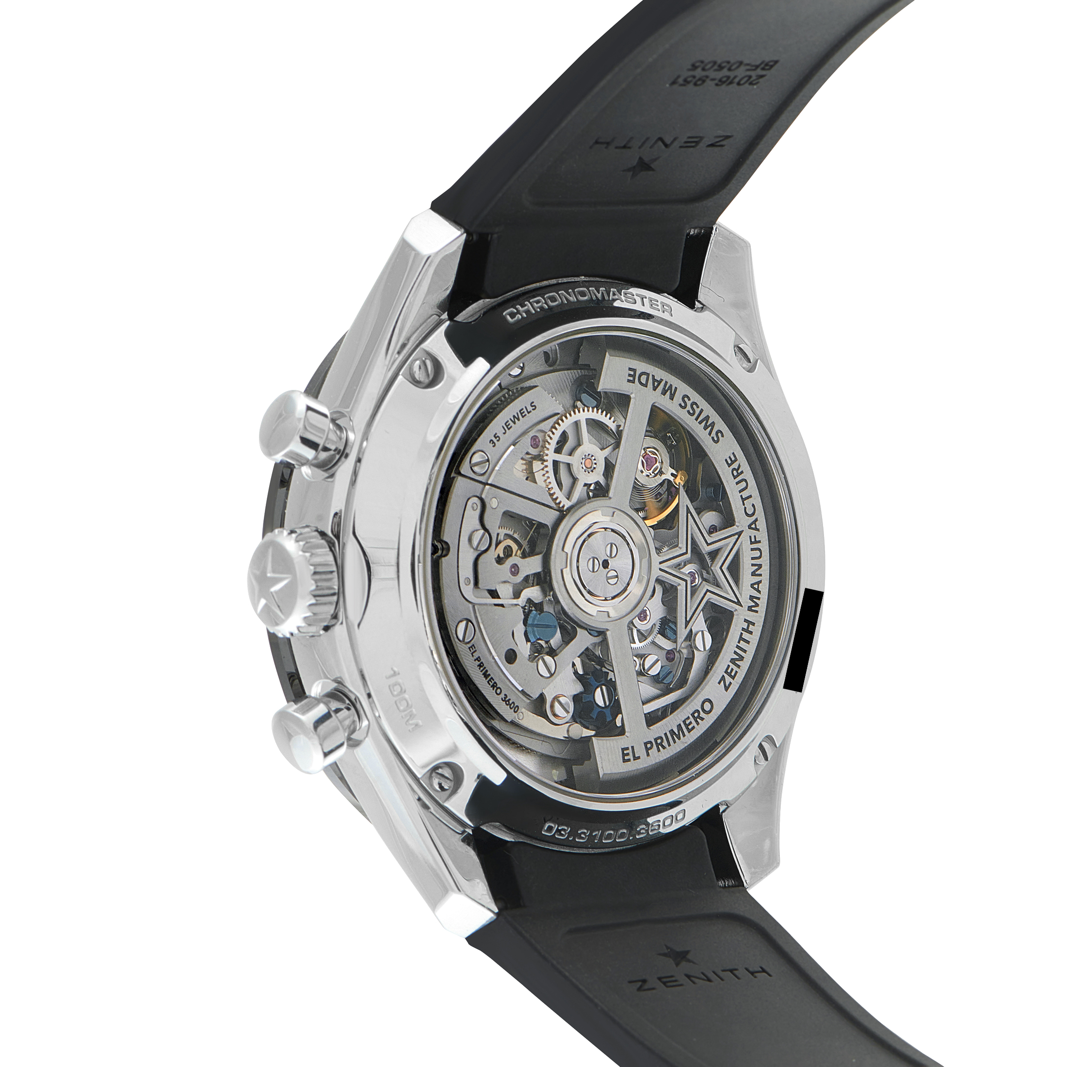 Zenith’s Chronomaster Sport features the brand’s high-frequency chronograph mastery presented with modern sport watch aesthetics. It has a 41mm stainless steel case with pump-style pushers, a black ceramic bezel with a 1/10th of a second scale, and a black rubber strap. The black dial is instantly recognizable by the signature tri-color sub-dials, which is a design that traces its roots back to the legendary 1969 original. Its beating heart is the powerful El Primero 3600 automatic movement, visible through the sapphire caseback, which boasts a 60-hour power reserve.