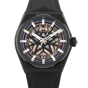 This limited edition timepiece is the result of the unique collaboration between Zenith and the luxury ski clothing tailor Fusalp. It features a lightweight yet robust 41mm black ceramic case housing a symmetric black openworked dial. The watch’s face showcases the emblematic Zenith five-pointed star masterfully integrated with delicate Fusalp snowflake motifs. Faceted hands and hour markers with Super-LumiNova ensure visibility while adding a dynamic visual depth to the dial. Its beating heart is the automatic caliber Elite 670 SK, a high-frequency movement with a reliable 50-hour power reserve. The watch is worn on a textured black rubber strap with a DLC-coated titanium clasp.