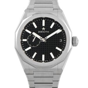 With its dark, clean look and steady mechanical rhythm, the Defy Skyline shows Zenith’s modern take on precision and style. The watch combines a 41mm stainless steel case, a faceted octagonal bezel, and a steel bracelet that easily swaps with a black rubber strap. The matte black dial shows a repeating four-point star pattern, creating depth without glare. Such serves as the perfect backdrop for the 1/10th-second sub-dial at 9 o’clock. Beating inside the watch is the high-frequency El Primero 3620 automatic movement, running at 5 Hz with a 60-hour power reserve.