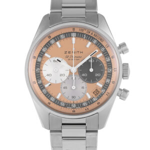 Equipped with a powerful El Primero 3600 automatic movement and an unexpected opaline salmon dial, this limited edition modern chronograph proves to be a truly desirable timepiece. ZENITH and Hodinkee collaborated to design this El Primero Chronomaster ref. 03.3201.3600/18.M3200. The watch boasts a well-made 38mm steel case worn on a tapered steel bracelet with polished central links. It has a distinct salmon opaline face in matte finish, detailed with three registers in three shades of gray. There is a salmon-colored date window between 4 and 5 o’clock and a 1/10th of a second tachymeter scale on the dial’s outer perimeter. Housed inside the case and visible from the transparent case back is the reliable caliber 3600 that offers 60 hours of power reserve.